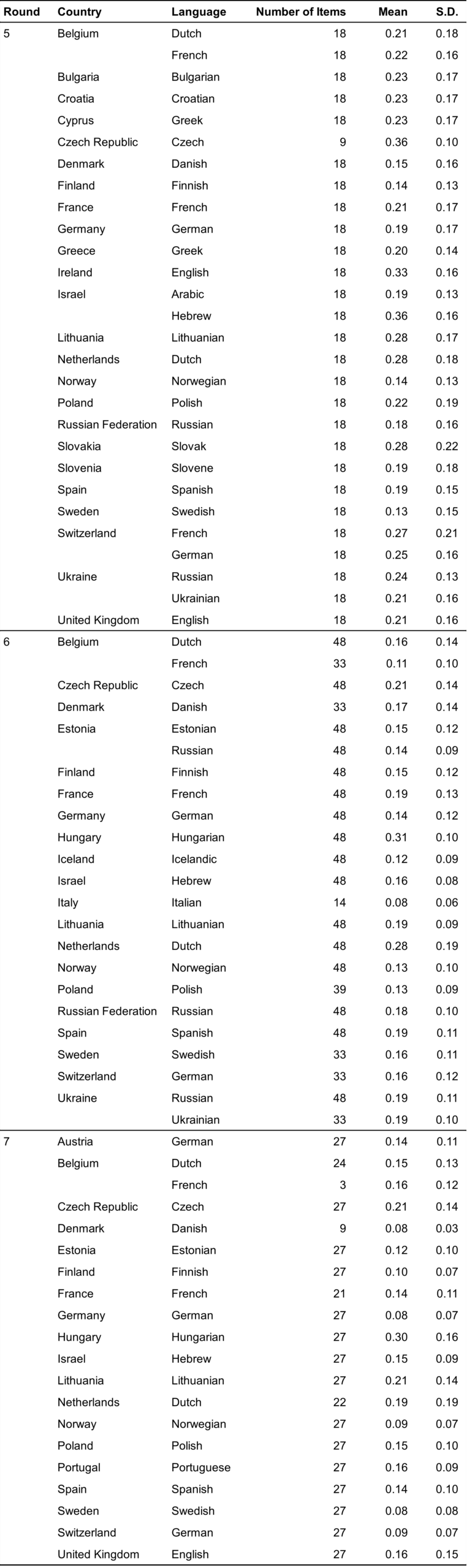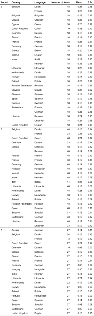 Table 1 presents the number of items, along with the mean and standard deviation of measurement error for all items within each country-language group, broken down by ESS round. The observed variation in mean measurement error across these groups indicates that, on average, the questionnaire performs better in some country-language contexts than in others. For instance, in round 5, the Swedish items in Sweden show the lowest mean measurement error, whereas the Hebrew items in Israel exhibit the highest. Notably, the Arabic items in Israel display considerably lower measurement error, highlighting the potential influence of language context within the same country. Examining the distribution of measurement errors within country-language groups reveals that the Slovakian items in Slovakia, in round 5, have the highest standard deviation. This suggests greater variability in measurement error across items compared to other country-language groups, indicating that some items perform much better—or worse—than others within that context.