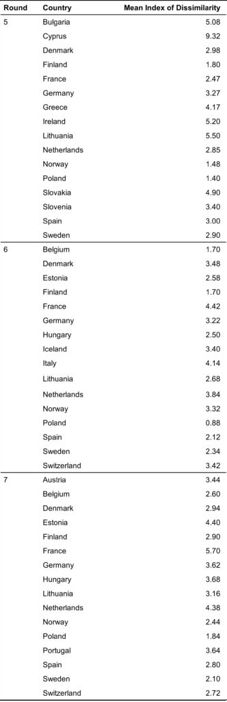 Note. The table is generated based on the information presented in Koch et al. (2014) and Koch (2016, 2018). The index averages the dissimilarity indices of gender, age, work status, nationality, and marital status, the latter only being available for rounds 6 and 7.