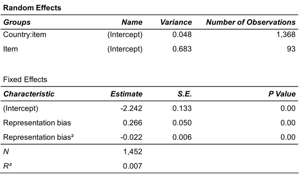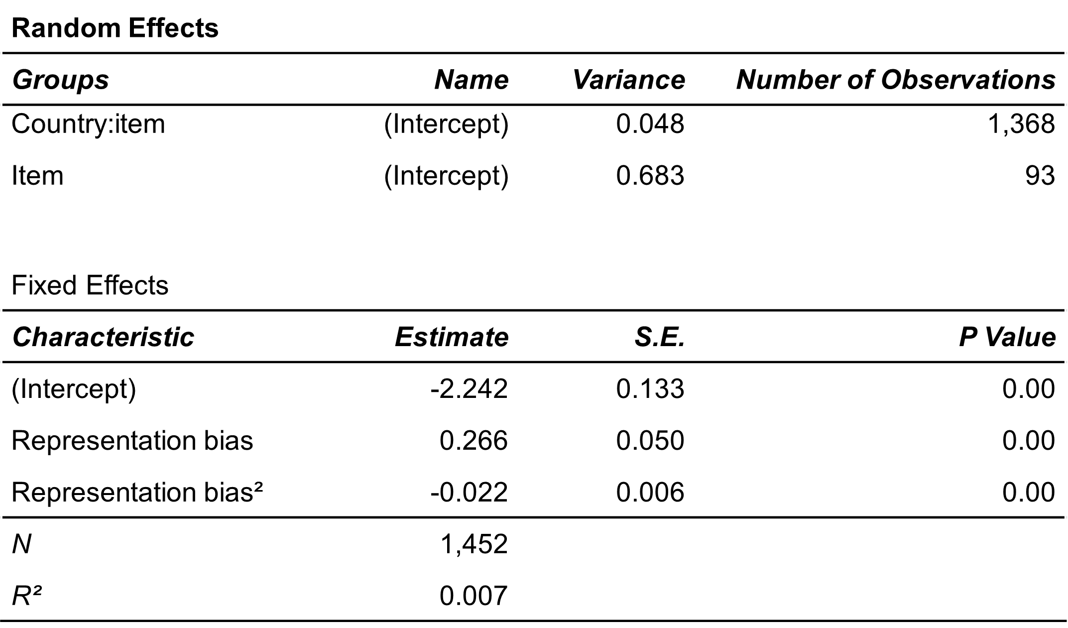 First, the estimated variance components of the random intercepts show that most of the unexplained variation of measurement error can be attributed to the item level rather than the country:item level. Second, the fixed effects of both the linear and squared terms of representation bias are statistically significant, suggesting a curvilinear relationship between representation bias and measurement error. However, including only representation bias as an independent variable explains little variation in measurement error (R² = 0.007).