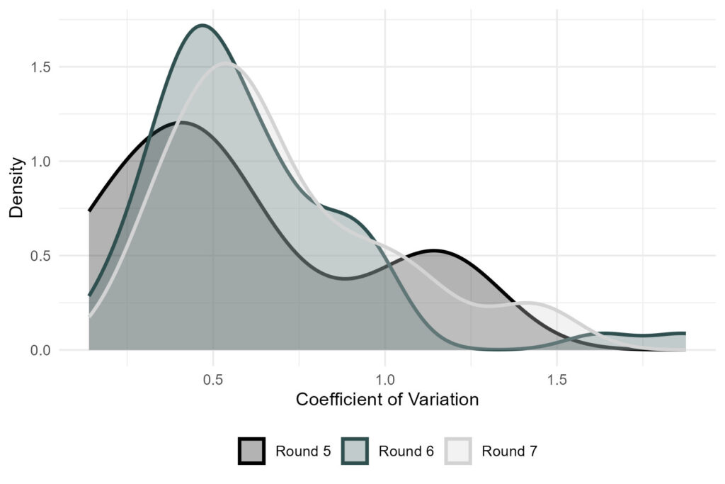 Figure 1. Distributions of the Coefficients of Variation of Measurement Error Across Country-Language Groups for All Items in ESS Rounds 5 to 7