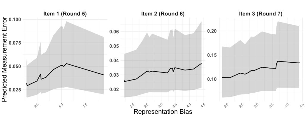 Figure 2 visualizes the predicted measurement errors along with their 95% confidence bands for these three items. For item 1, the relationship follows a curvilinear pattern. Measurement error increases with representation bias up to a value of around 5, and then decreases at higher levels of representation bias. Representation bias in rounds 6 and 7 does not exceed a value of 5, thus, no reversal effect is observed for items 2 and 3, which were fielded in those rounds.
