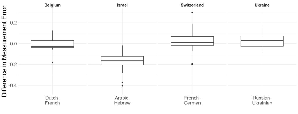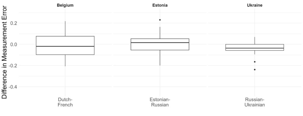 In round 6 (Figure 4), similar patterns emerged. Belgium again showed near-zero average differences, with French items having slightly higher measurement error than Dutch items. In Estonia, differences were minimal, with Estonian items outperforming Russian items. Ukraine showed a reversed pattern compared to round 5: Ukrainian items had higher measurement error on average than Russian items.