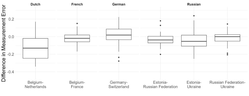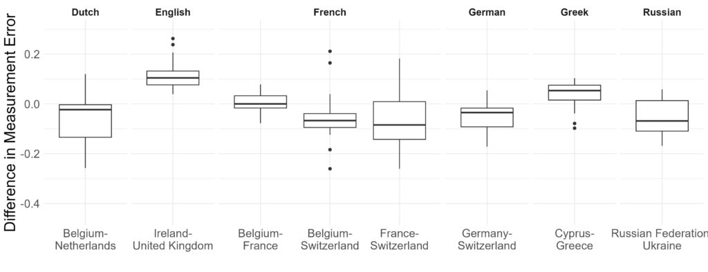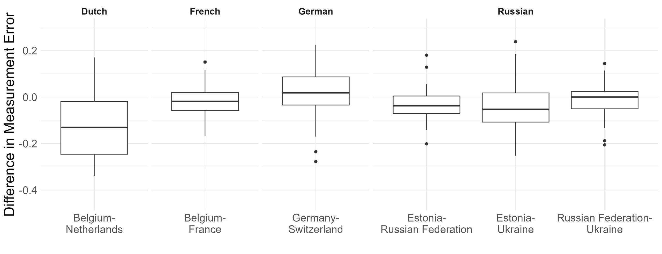For French, items were fielded in Belgium, France, and Switzerland. Thus, Figure 5 holds three boxplots for each possible country-pair comparison. The average measurement error difference between Belgium and France was zero, with very low variation. Belgium, however, showed lower measurement error than Switzerland for most items. The largest and most variable differences were between France and Switzerland, with Switzerland exhibiting much higher measurement error on average, although item-level variation suggests some items perform better in France and others in Switzerland.