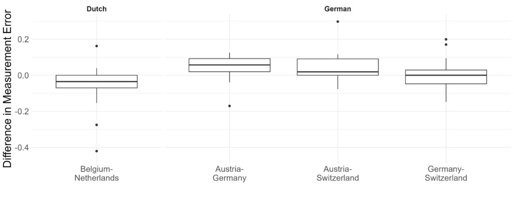 The analysis of ESS round 7 (see Figure 7) replicates the above-mentioned pattern of Dutch items exhibiting higher measurement error in the Netherlands compared to Belgium. German items, fielded in Austria, Switzerland, and Germany, had consistently higher measurement error in Austria relative to the other two countries. Differences between Switzerland and Austria were smaller but with more variation, while the median difference between Germany and Switzerland was close to zero.