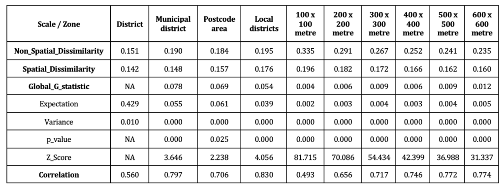 As a result, MAUP presents a significant challenge to the comparison of analytical results, as varying spatial scales and zoning configurations can yield divergent conclusions regarding the same phenomenon. For example, an analysis conducted at the neighbourhood level may suggest a strong correlation between the number of Germans and foreigners, whereas the same analysis conducted at a spatial resolution of 500 x 500 metres may reveal a substantially weaker correlation. Furthermore, the sensitivity to spatial scale and zoning configuration extends to the calculation of spatial and non-spatial dissimilarity indices, which compromises the validity of comparisons across analytical results.