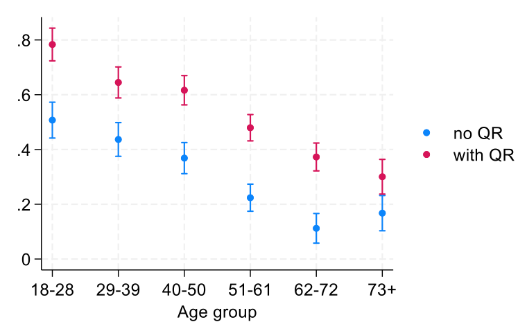 Notes: Data: DDS-21, CSS5, design weighted, Number of observations =1444 without, 1592 with QR code. The figure contains predicted shares from the applied models.