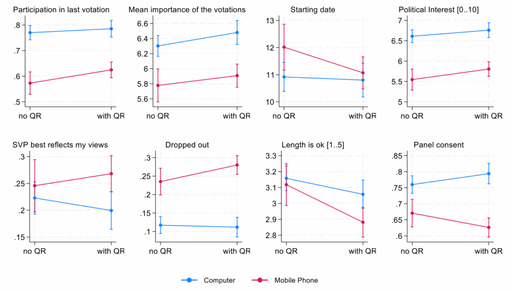 Overall, Figure 2 suggests that respondents who use a mobile phone are harder to survey. Among those who switch from a computer to a mobile phone due to the QR code, three distinct patterns emerge. The first two seem to result primarily from selection effects: