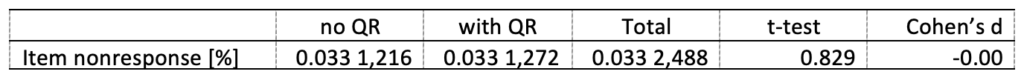 As table H5 shows, there is no difference in item nonresponse between finishers by QR code, which is in line with the zero effect from Cohen’s d.
