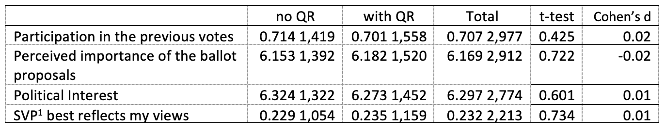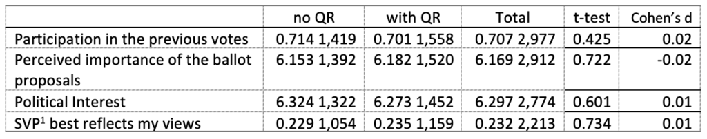 Regarding political variables, we analyze the means of turnout, the perceived importance of the ballot proposals, political interest (all of which are typically overrepresented, particularly in voting surveys), as well as right-wing populist vote (which is typically underrepresented) by the QR variable. T-tests show that the means of all variables is independent of whether a QR code is provided. In line with this finding, Cohens’d suggests no effect for all four variables.