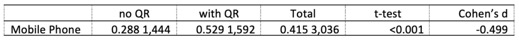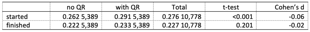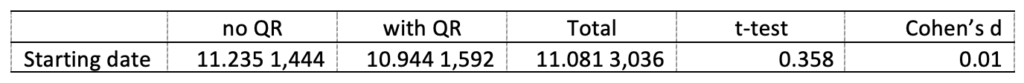 The mean starting date of the survey does not differ depending on whether a QR code is provided, as shown by Table H4. This independence is confirmed by the very small value of Cohen’s d.