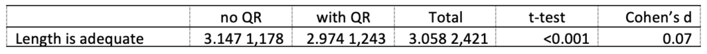 According to earlier studies, QR codes signal a short survey (Lugtig and Luiten 2021). This led us to expect that respondents in the QR code group would be less satisfied with our rather long questionnaire. This is indeed the case: those who received an invitation with QR code are significantly less satisfied with the length of the survey with a considerable effect size of 0.173. However, Cohen’s d suggests only a small effect size.