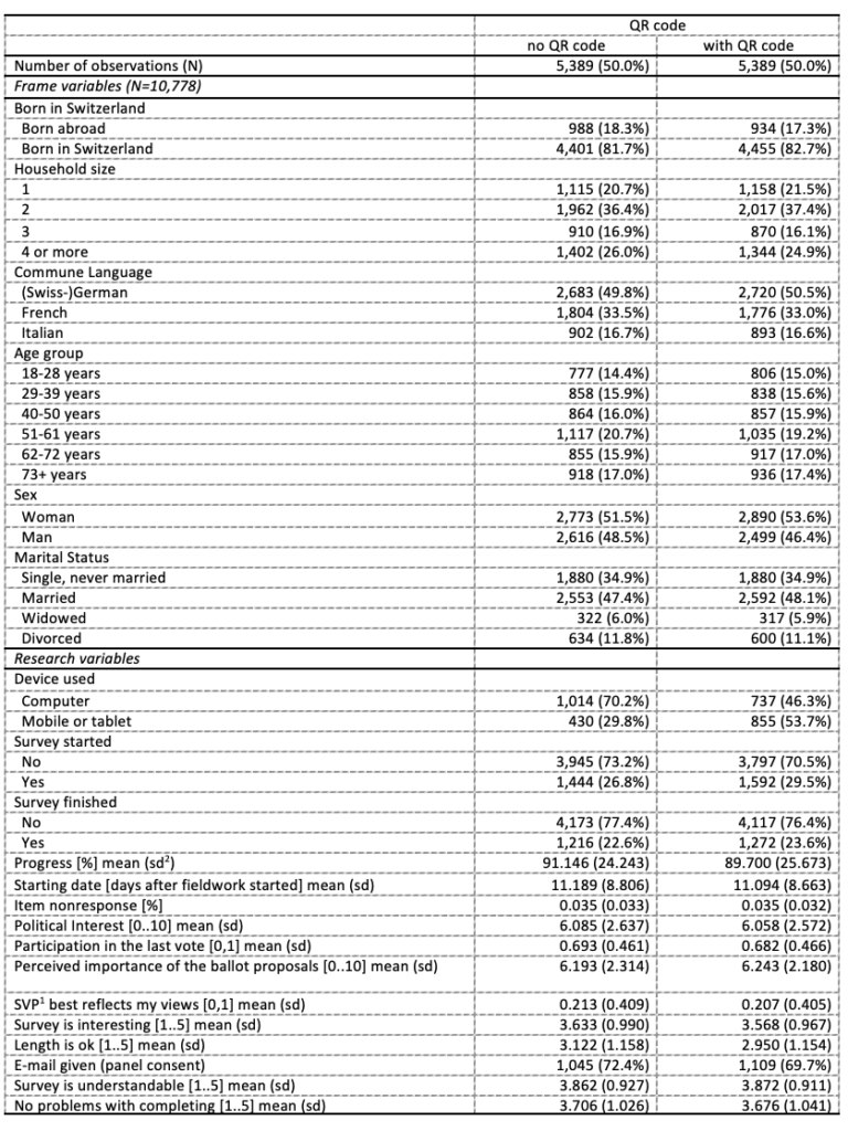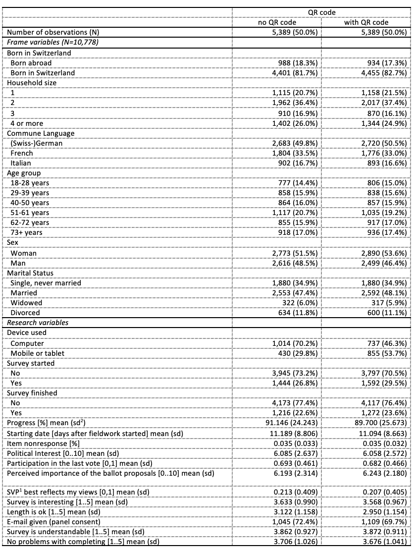 We first list descriptives of all variables, by QR code provision, and check the randomization into the two QR designs based on the frame variables.